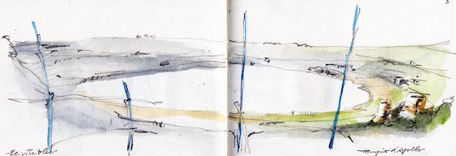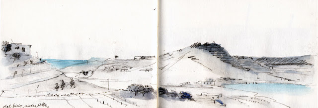 Oltre agli acquerelli (su blocco Daler Rowney) ho preso appunti su un piccolo taccuino per il nostro itinerario disegnato, mentre Cassandra Cumana ha scattato qualche foto, come quella qui sotto: i vigneti con i pali blu al lago d'Averno, ai piedi del Monte Nuovo.